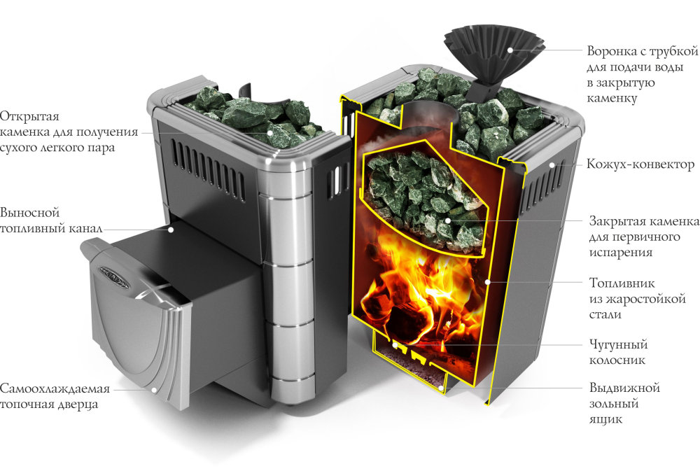 Закрытая первичная каменка обладает достаточной теплоемкостью для частых интенсивных подач воды.