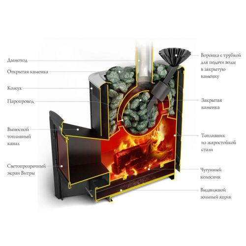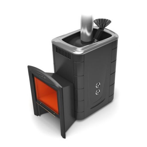 Термофор Гейзер 2014 Inox Витра ЗК ТО антрацит - печь рассчитана на парилки объемом от 8 до 18 м3. Оснащена уникальной системой двойного парообразования, которая позволяет получить исключительно качественный легкий пар. Закрытая каменка прогревается пламенем со всех сторон, камни в ней нагреваются до 600°С. Воронка со встроенным клапаном-дозатором поможет налить именно столько воды, сколько надо, и не позволит «залить» камни. Центральное размещение дымохода облегчает и упрощает монтаж дымохода. Повышенная надежность печи обеспечивается термической равнопрочностью - теплонагруженные элементы выполнены из жаростойкой стали толщиной 3 мм. Отличительной особенностью от базовой версии является наличие большого светопрозрачного экрана «Витра» с диагональю 42 см и встроенного теплообменника для нагрева воды в выносном баке.