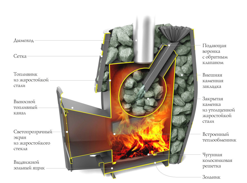 В обычных банных печах камни внутри, а печка снаружи. В печах-сетках всё наоборот: печка внутри, а камни снаружи.