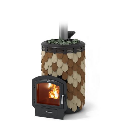 Модификация, изготовленная из нержавеющей жаростойкой стали с закрытой каменкой. Имеет чугунную дверью и большой светопрозрачный экран, глиняные изразцы конвектора 2х цветов «шамот-терракота». Отличается отсутствием декорированного изразцами дымохода в комплекте.