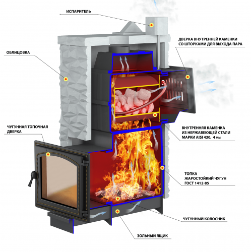 В данном комплекте пар можно получить двумя способами: можно поддавать воду в закрытую каменку печи через специальную лейку, либо поддать воду на камни через дверцу, которая идет в комплекте.