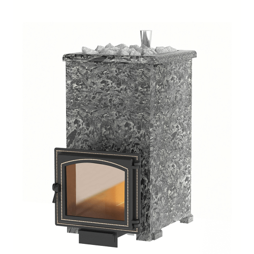 Данную модель печи отличает от аналогов то, что закрытая каменка расположена внутри топки. Это позволяет максимально быстро и хорошо прогревать камни, которые расположены внутри каменки. На камни через специальную трубку с отверстиями поддается вода, которая моментально испаряется, превращаясь в мелкодисперсный пар.