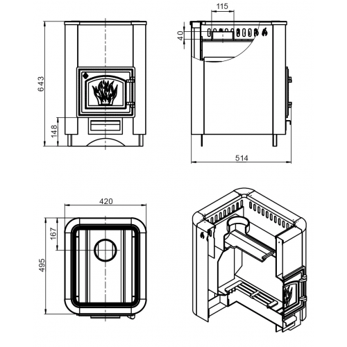 Дверка, пламегаситель и колосник изготовлены из чугуна, что увеличивает их прочность и срок службы.