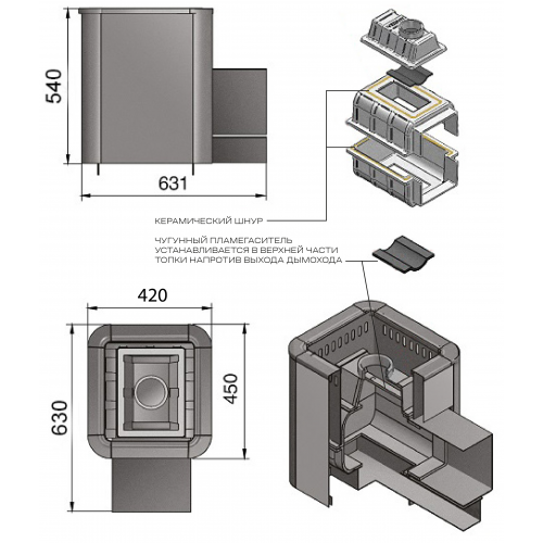 Преимущество печи в том, что топка печи состоит из 3-х элементов. На стыке между ними используется керамический шнур с рабочей температурой 1200 градусов. То есть топка печи абсолютно герметична!