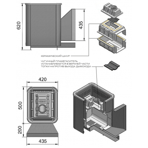 Преимущество печи в том, что топка печи состоит из 3-х элементов. На стыке между ними используется керамический шнур с рабочей температурой 1200 градусов. То есть топка печи абсолютно герметична!