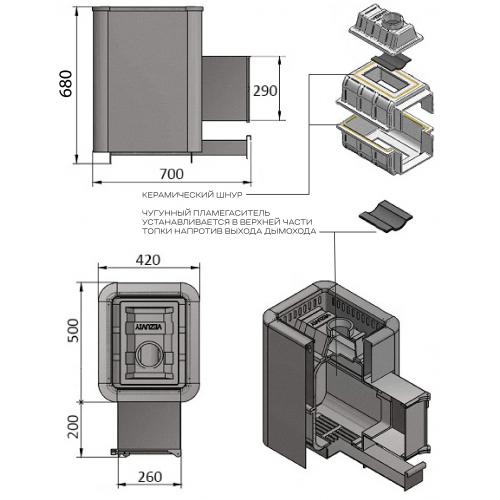 Преимущество печи в том, что топка печи состоит из 3-х элементов. На стыке между ними используется керамический шнур с рабочей температурой 1200 градусов.