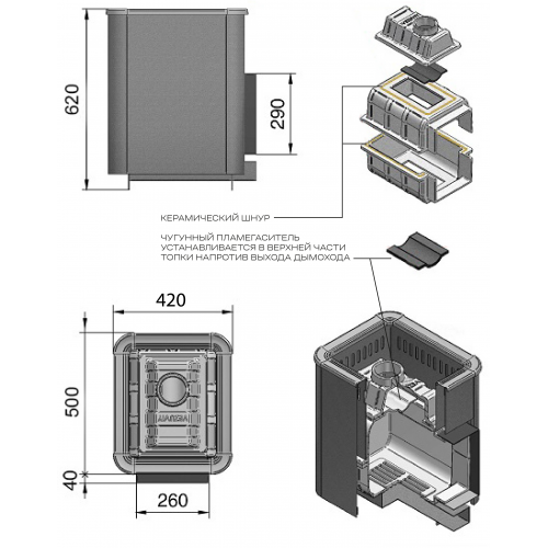 Преимущество печи в том, что топка печи состоит из 3-х элементов. На стыке между ними используется керамический шнур с рабочей температурой 1200 градусов. То есть топка печи абсолютно герметична!