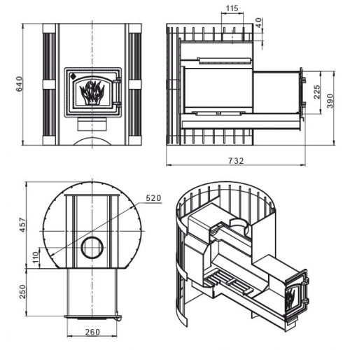 Съёмный чугунный колосник в сочетании со скошенными краями боковой части стенки облегчает уход за топкой, уборки золы и несгоревших углей.