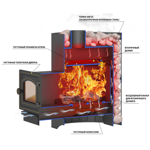 Чугунный пламегаситель перенаправляет поток горячего воздуха и дымовых газов к задней части топки. Это позволяет снять с печи максимум энергии в единицу времени.
