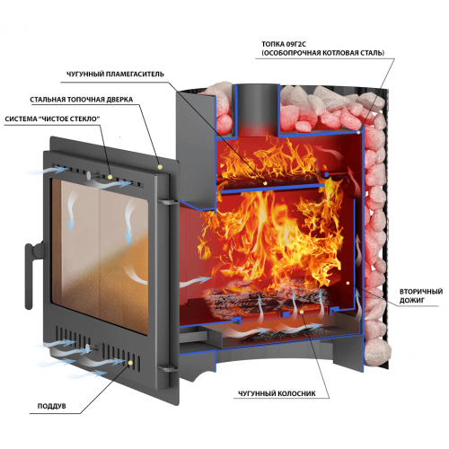 Широкая стальная панорамная дверь оборудована термостойким стеклом и выдерживает температуру до 650 градусов. В двери имеются системы верхней и нижней подачи воздуха.