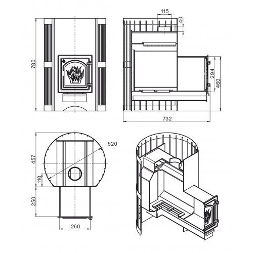 Чугунная дверь при нагревании не деформируется, сохраняет свою форму при остывании и предотвращает попадание продуктов горения на пол перед топкой.
