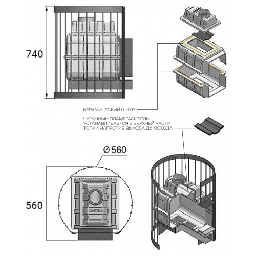 Преимущество печи в том, что топка печи состоит из 3-х элементов. На стыке между ними используется керамический шнур с рабочей температурой 1200 градусов. То есть топка печи абсолютно герметична!