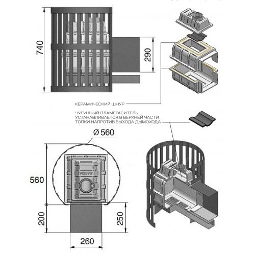 Преимущество печи в том, что топка печи состоит из 3-х элементов. На стыке между ними используется керамический шнур с рабочей температурой 1200 градусов. То есть топка печи абсолютно герметична!