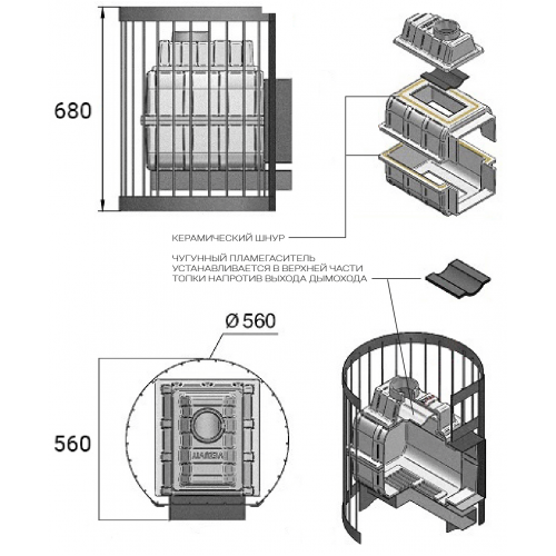 Преимущество печи в том, что топка печи состоит из 3-х элементов. На стыке между ними используется керамический шнур с рабочей температурой 1200 градусов. То есть топка печи абсолютно герметична!