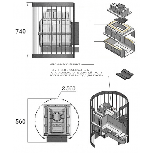 Преимущество печи в том, что топка печи состоит из 3-х элементов. На стыке между ними используется керамический шнур с рабочей температурой 1200 градусов. То есть топка печи абсолютно герметична!