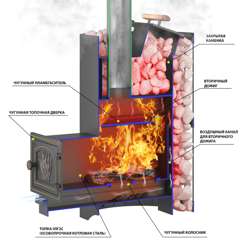 Топочный тоннель также выполнен из стали марки 09Г2С толщиной 4 мм, что позволяет топить дрова длиной более 50 см. Топка оснащена каналом для подачи воздуха на вторичный дожиг дымовых газов.