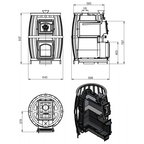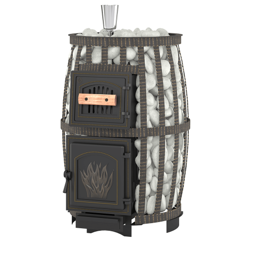 Все элементы топки отлиты из жаропрочного чугуна и соединены между собой с помощью болтового соединения через термостойкий шнур и герметик, а закрытая каменка изготовлена из жаростойкой высоколегированной 4 мм нержавеющей стали. Вес камней в закрытой каменке — 25-40 кг.