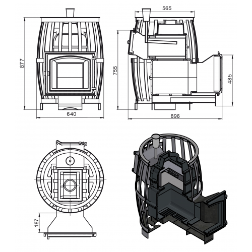 Все элементы топки отлиты из жаропрочного чугуна и соединены между собой с помощью болтового соединения через термостойкий шнур и герметик, а закрытая каменка изготовлена из жаростойкой высоколегированной 4 мм нержавеющей стали.
