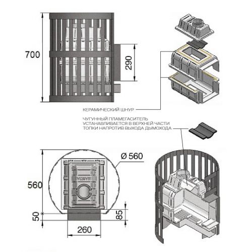 Преимущество печи в том, что топка печи состоит из 3-х элементов. На стыке между ними используется керамический шнур с рабочей температурой 1200 градусов. То есть топка печи абсолютно герметична!