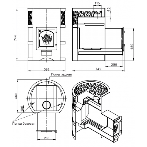 Вместе с тем, данная конструкция стенок предполагает направление дров ближе к колосниковой решётке, что обеспечивает полное прогорание топлива.