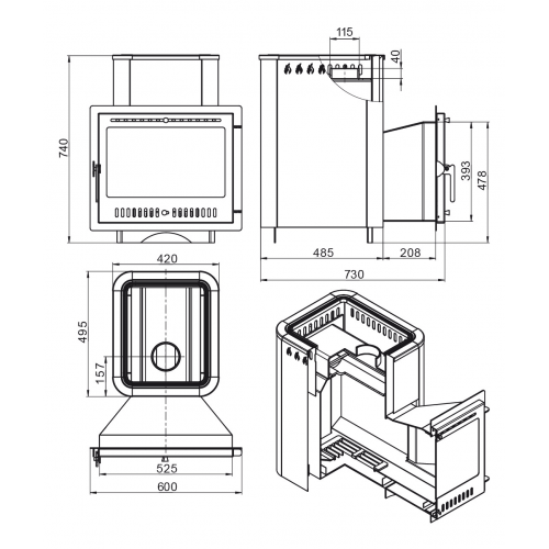 Стальная топка имеет скошенные углы в нижней части боковых стенок, что делает уход за топочным пространством максимально простым, а эффективность сгорания дров – максимальным.