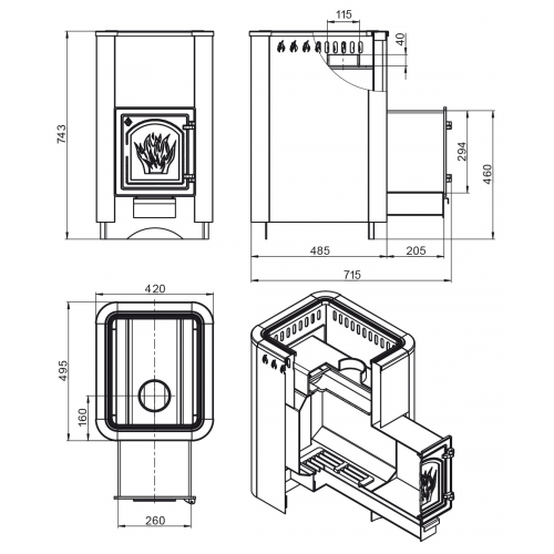 Дверка, пламегаситель и колосник изготовлены из чугуна, что увеличивает их прочность и срок службы.