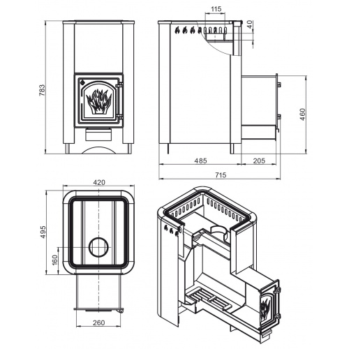 Дверка, пламегаситель и колосник изготовлены из чугуна, что увеличивает их прочность и срок службы.