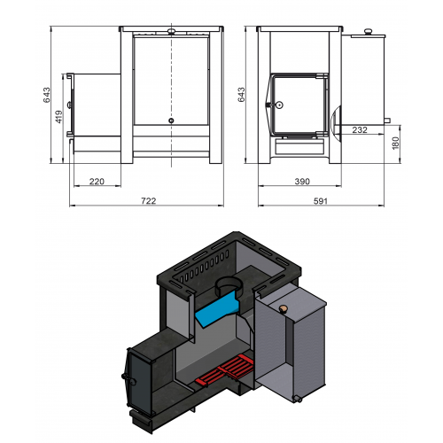 Объём топки позволяет быстро и качественно нагреть парилку и одновременно получить достаточное количество горячей воды.