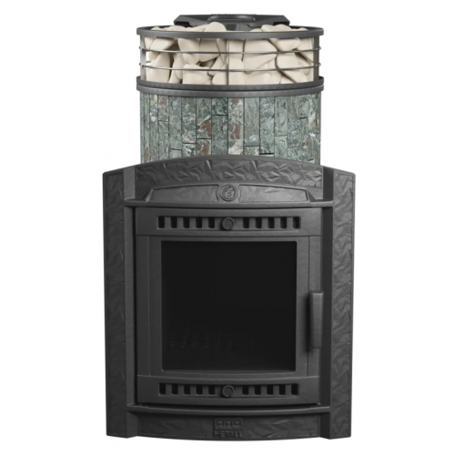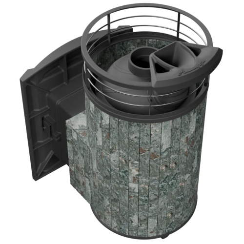 Практичная и компактная модель. Ламели из змеевика по периметру внешней каменки не только обладают хорошими теплонакопительными свойствами, но и придают печи оригинальный внешний вид.
