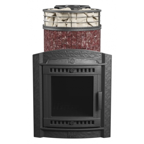Практичная и компактная модель. Ламели из змеевика по периметру внешней каменки не только обладают хорошими теплонакопительными свойствами, но и придают печи оригинальный внешний вид.
