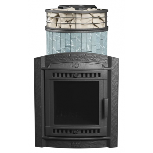Практичная и компактная модель. Ламели из змеевика по периметру внешней каменки не только обладают хорошими теплонакопительными свойствами, но и придают печи оригинальный внешний вид.