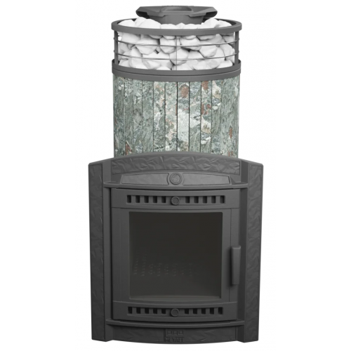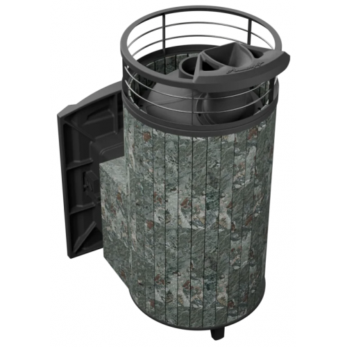 Модель с увеличенной каменкой и повышенной производительностью. Ламели из змеевика по периметру внешней каменки не только обладают хорошими теплонакопительными свойствами, но и придают печи оригинальный внешний вид.