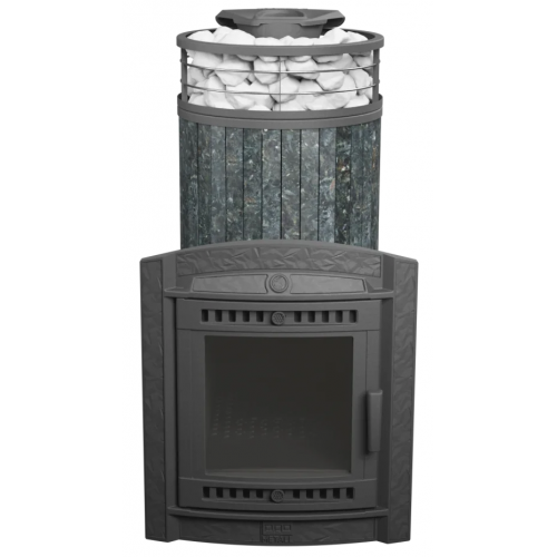 Модель с увеличенной каменкой и повышенной производительностью. Ламели из змеевика по периметру внешней каменки не только обладают хорошими теплонакопительными свойствами, но и придают печи оригинальный внешний вид.