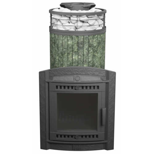 Модель с увеличенной каменкой и повышенной производительностью. Ламели из змеевика по периметру внешней каменки не только обладают хорошими теплонакопительными свойствами, но и придают печи оригинальный внешний вид.