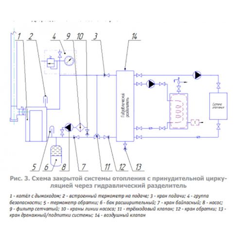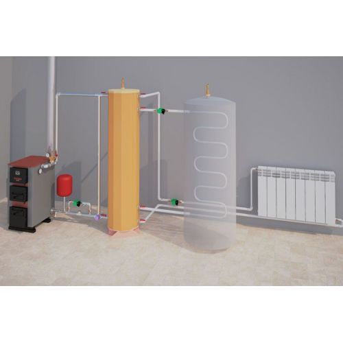Современная система отопления, собранная по лучевой схеме, с коллекторными узлами управления и распределения чаще всего собирается из полимерных труб, а они очень чувствительны к перегреву теплоносителя и не выдерживают гидроударов (при закипании теплоносителя в котле). Поэтому для согласования малообъемной системы отопления и твердотопливного котла необходим узел, балансирующий систему. Лучше всего эту задачу решает емкостной гидравлический разделитель - специальная емкость определенного объема, через которую циркулирует теплоноситель из котла и теплоноситель из системы отопления. Гидравлический разделитель подбирают из расчета минимум 10 литров ёмкости на 1 кВт мощности котла. Емкостной гидравлический разделитель дает возможность согласовывать многоконтурную систему отопления, включающую радиаторы, теплые полы и бойлер для производства горячей воды. На выходе из котла обязательно устанавливается группа безопасности: автоматический воздушный клапан, термометр и манометр. Гидравлический разделитель также дублируется группой безопасности. Подпитка системы отопления делается на «обратке» или на нижней части гидравлического разделителя. |