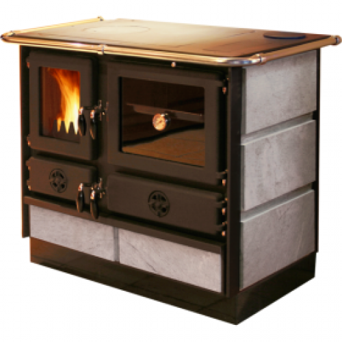 Дровяная кухонная плита предназначена для отопления небольших дачных домов и приготовления пищи. Печь изготовлена из чугуна и эмалированной стали. Эмалированное покрытие обеспечивает продолжительный срок службы печи и отвечает за эстетичный внешний вид. Доступно четыре цвета эмалированного покрытия: красный, кремовый, бордовый и черный. Печь укомплектована большой чугунной варочной поверхностью с одной конфоркой и стальным эмалированным духовым шкафом для приготовления пищи. Духовой шкаф габаритами ВхШхГ, мм - 265х350х465 оснащён протвенем и датчиком температуры. Для подключения к системе водяного отопления используется теплообменник-змеевик объёмом 11 л и мощностью 8.5 кВт. Топочная камера состоит из чугунных плит. Дверцы топки и духовки укомплектованы термостойкой стеклокерамикой. Замок и уплотнительный шнур обеспечивают герметичное закрывание дверец. Проём для загрузки дров Ш?В - 280х230 мм. Ящик для золы спрятан за герметичной чугунной дверцей. Дверца зольника снабжена устройством точной регулировкой подачи воздуха в топочную камеру. Колосниковая решетка подвижная для встряхивания золы. Для подключения к дымоходу предусмотрен патрубок, который монтируется на верхней и задней части плиты, справа или слева.