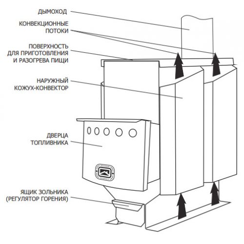Отопительная печь Теплодар Т-100 - печь для отопления помещений до 100 м.куб. Ее преимущества: экономичность, надежность, простота в эксплуатации. Поддерживается два режима горени: интенсивный и экономичный. Управление режимами осуществляется открытием (закрытием) ящика зольника. Для поддержания тепла в помещении одной закладки топлива достаточно на 2-3 часа непрерывной работы (в режиме экономичного горения). Верхняя поверхность печи может быть использована для готовки и разогрева пищи.