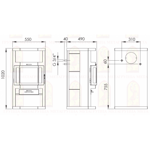 Пристенная печь с панорамным обзором оборудованная водяным теплообменником. Разработана как основной или вспомогательный отопительный прибор для современного дома площадью до 90 м2. Призматическая дверка из трех стекол высотой 330 мм. В отделке боковых поверхностей используется керамическая плитка. Размер поленьев 30 – 50 см. Подсоединение к дымоходу сверху или сзади.