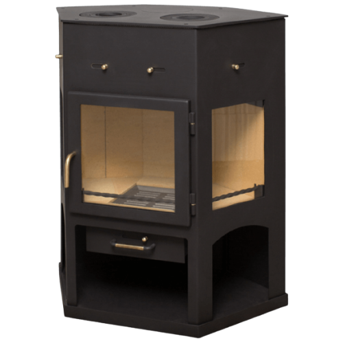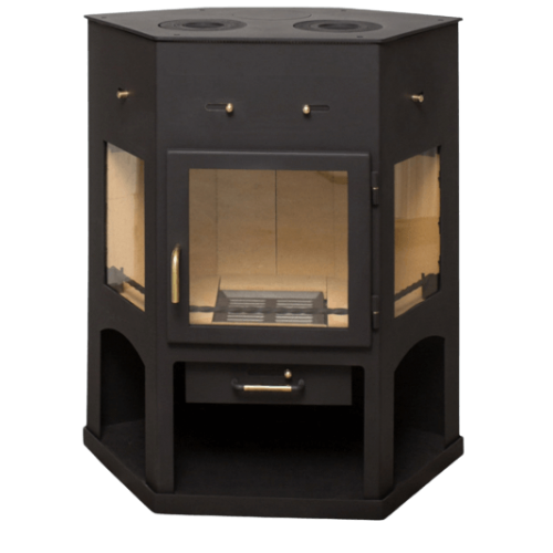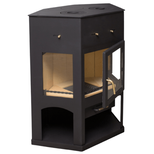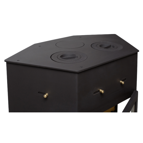 Мощная пристенная печь с большим панорамным обзором. Большая плоская дверка по центру и два боковых стекла дают максимально возможный обзор горения в большой топке. Идеально подходит для обогрева помещения площадью 55-110 м2. Верхняя крышка изготовлена их стали толщиной 10 мм и укомплектована 2 чугунными конфорками. Подсоединение к дымоходу сверху или сзади.