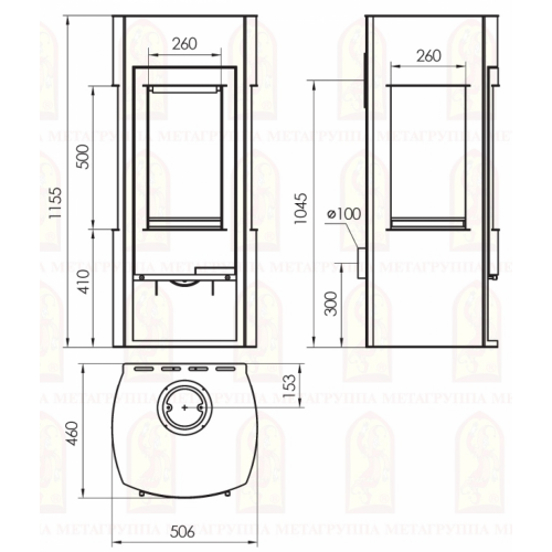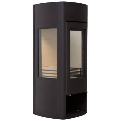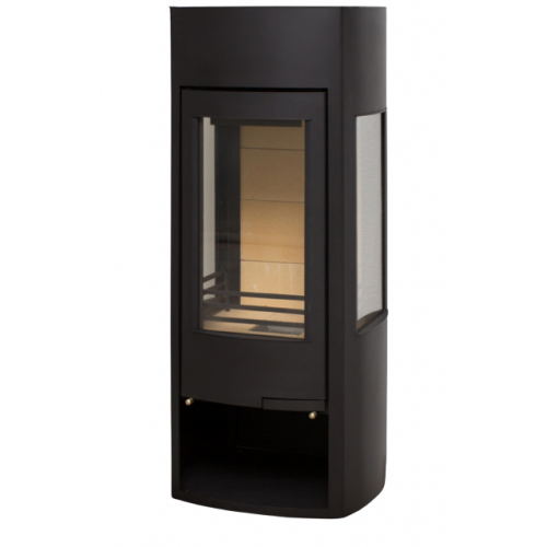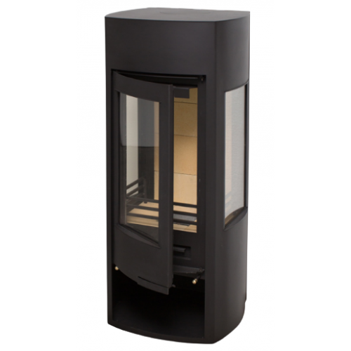 Пристенная высокая дизайнерская печь с панорамным обзором. Обзор огня с трех сторон. Оборудована большой остекленной дверкой выполненной в одной плоскости с корпусом печи и с двумя боковыми стеклами. Дверка высотой 600 мм и боковые стенки выполнены с небольшим радиальным изгибом. Ручка открывания утоплена внутрь дверки. Подсоединение к дымоходу сверху или сзади.