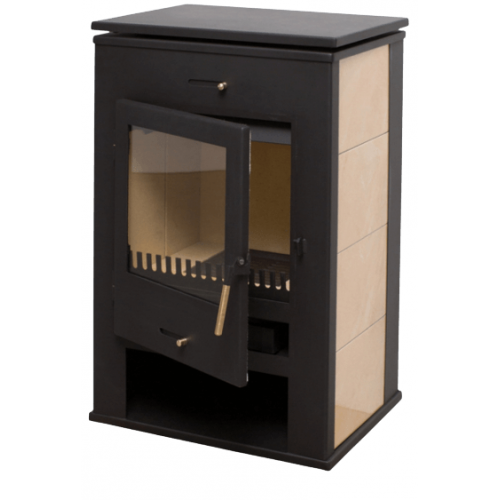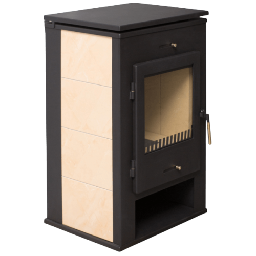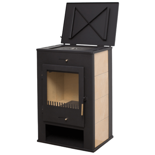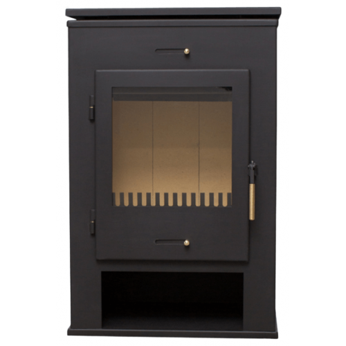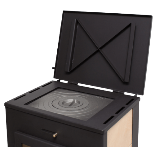 Классическая пристенная печь. Верхняя панель оборудована варочной плитой. Высокая дверка высотой 550 мм закрывает зольный ящик и топочную камеру. Идеально подходит для обогрева загородного домика площадью 40-80 м2. Кроме обогрева помещения можно разогреть пищу или вскипятить чайник. Важно! Данная модель может эксплуатироваться с закрытой декоративной крышкой. Плоская со стеклом дверка высотой 550 мм. Подсоединение к дымоходу сзади.