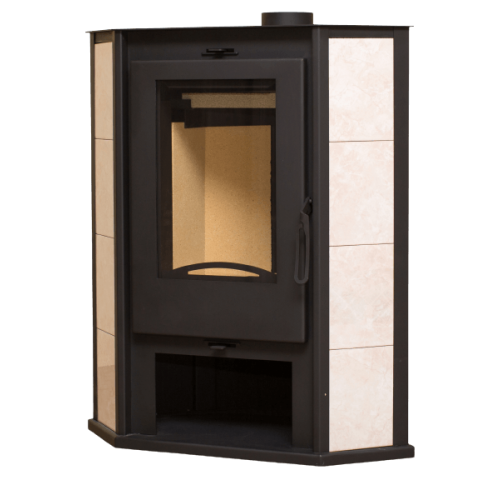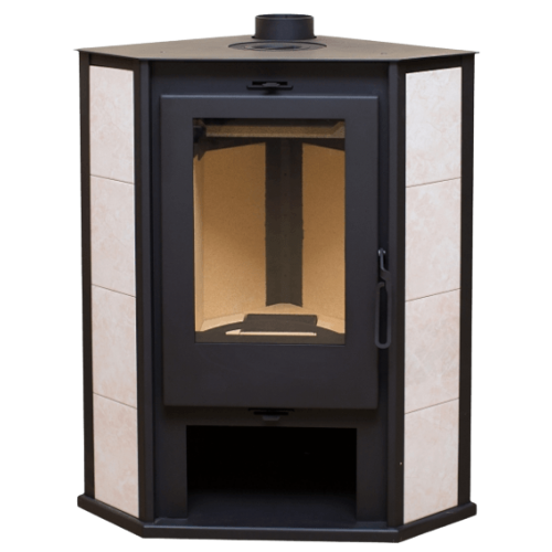 Компактная угловая печь с диаметром дымоходного патрубка 115 мм. Печь оснащена системой «регулируемого вторичного дожига». Верхняя панель оборудована чугунной варочной плитой. Идеально подходит для обогрева небольшого загородного домика площадью 30-60 м2. Кроме обогрева помещения можно разогреть пищу или вскипятить чайник. Размер поленьев 25 -27 см. Подсоединение к дымоходу сверху.