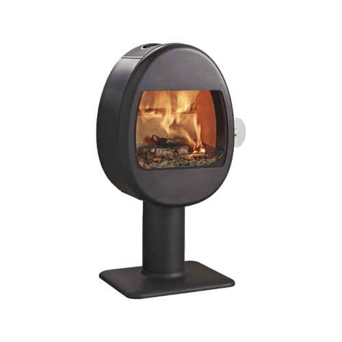 Печь-камин на дровах Scan 66-2 BP — PEDESTAL чёрного цвета (BP), на пьедестале, мощностью от 3 до 7 кВт, обогревает поверхность дома площадью до 100 м2.