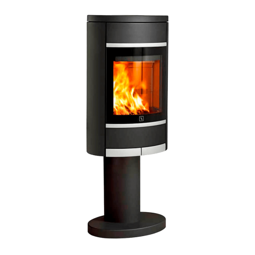 Печи камин Scan серии 68-4 имеют полукруглую форму с большим обзорным стеклом, выполнены в современном дизайне. Устанавливаются на ноге — пьедестале, имеет вставки и ручку черного цвета.