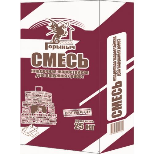 Смесь кладочная жаростойкая для наружных работ Горыныч НАЗНАЧЕНИЕ: Применяется в качестве раствора для кладки печей и каминов и других объектов, эксплуатируемых в условиях высоких температур и подвергаемых воздействию атмосферных осадков.