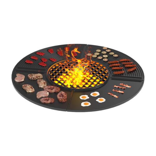 Небольшой бортик по краю плиты ограничивает рабочее пространство, предотвращает попадание жира в огонь и его возгорание. В середине плиты размещена чугунная решётка Везувий Стейк. Эта решётка предназначена для готовки мяса и овощей с красивым диагональным рисунком. Большая теплоёмкость чугуна позволяет быстро приготовить на очаге мясо, рыбу, овощи, грибы и другие продукты в различных вариациях.