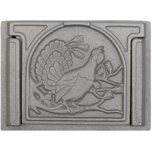 Чугунная прочистная дверца с уплотнённым лабиринтным соединением. Предназначена для чистки печных каналов. Может устанавливаться на любой вид кирпичных печей. Дверца украшена барельефным рисунком тетерева.