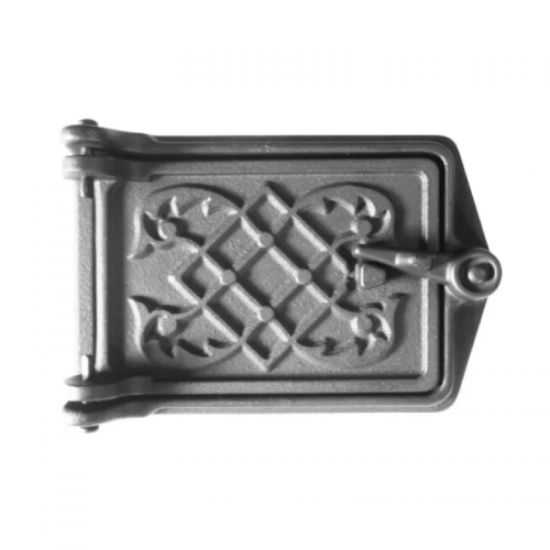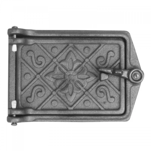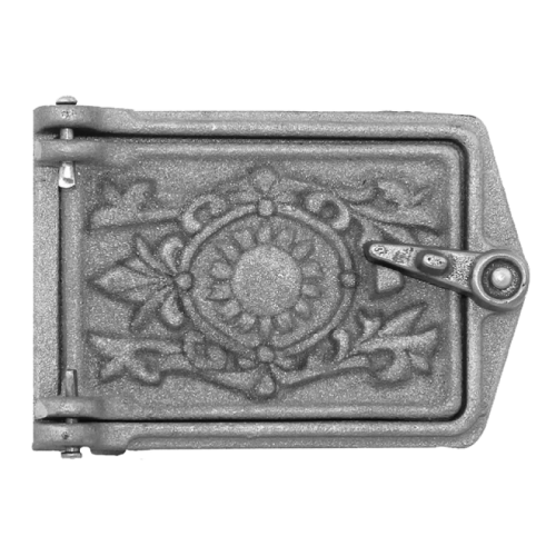 Прочистная дверца из серого чугуна. Симметричный барельефный рисунок позволяет выбирать направление открывания дверцы право или лево. Дверку можно приобрести в комплекте с топочной и поддувальной, серии с рисунком «Восход».